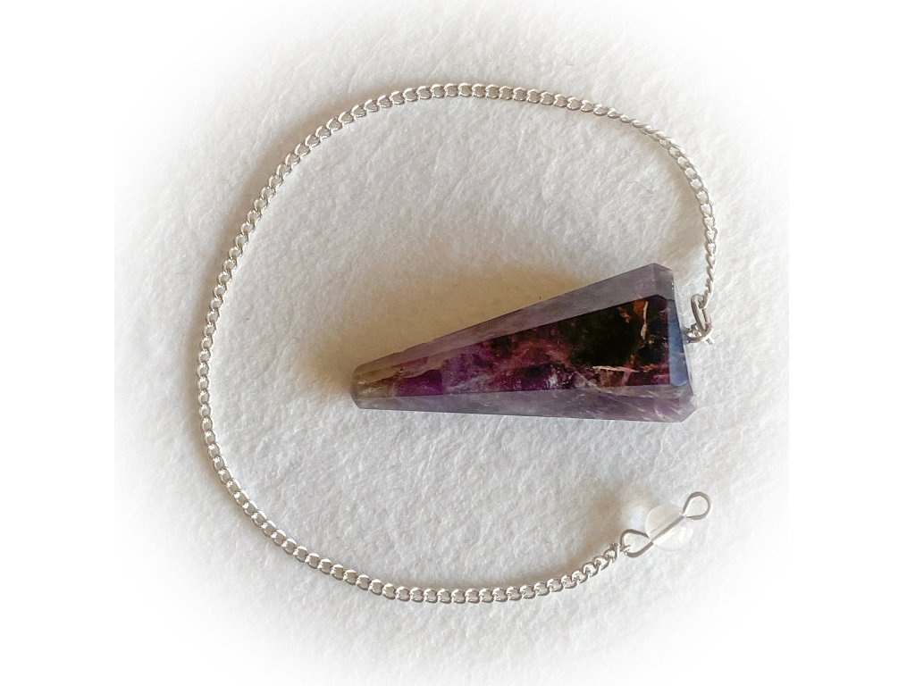 Kyvadlo z facetovaného ametystu, délka kamene 4 cm.